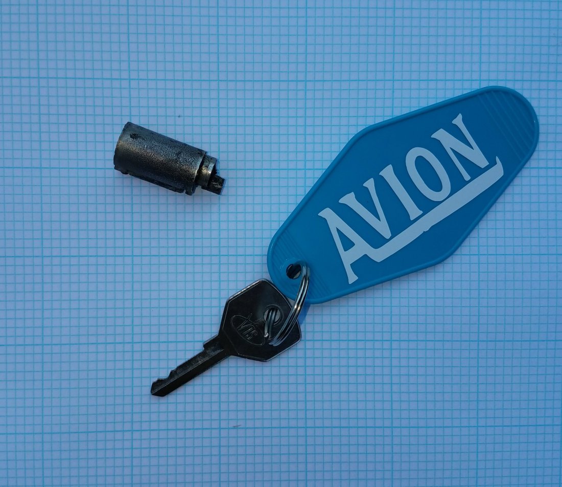 The caravan can now be properly secured. It took a little ingenuity (known as a flat blade screwdriver and a hammer), but I was able to pop out the old lock tumbler (which had no key) and install a new one. As a bonus, my new custom keychain arrived, too.